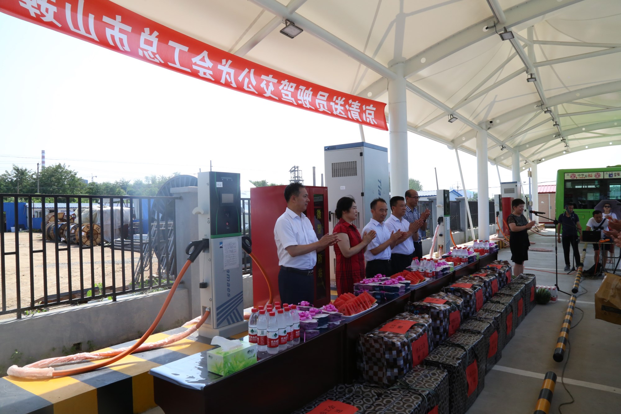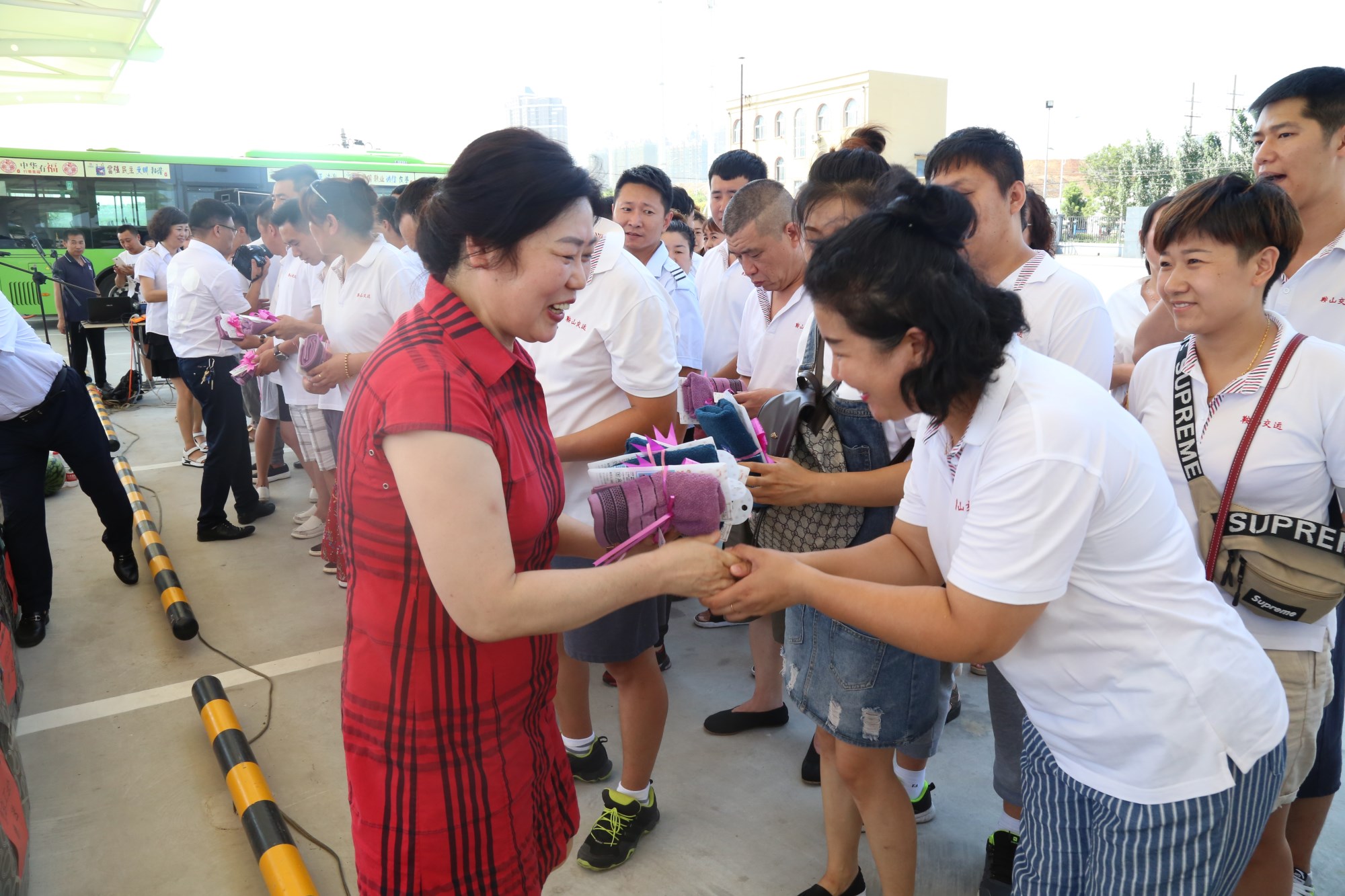 2018年8月1日下午,鞍山市總工會(huì)在交運(yùn)集團(tuán)第二汽車分公司216路終點(diǎn)站舉行了為公交一線駕駛員送清涼活動(dòng)。鞍山市人大常委會(huì)副主任、市總工會(huì)主席解永孚;市總工會(huì)副主席李展程;市國資委黨委書記、主任顧洪新等領(lǐng)導(dǎo)來到216路調(diào)度室看望了交運(yùn)集團(tuán)一線駕駛員,為他們送去夏日里的清涼與工會(huì)組織的慰問。交運(yùn)集團(tuán)黨委書記、董事長羅玉艷;總經(jīng)理王春江;黨委副書記、紀(jì)委書記、工會(huì)主席金秀石出席了活動(dòng)。活動(dòng)中,交運(yùn)集團(tuán)黨委書記、董事長羅玉艷向市總工會(huì)領(lǐng)導(dǎo)介紹了企業(yè)生產(chǎn)運(yùn)營情況,并代表集團(tuán)職工向市總工會(huì)表示感謝。隨后,市總工會(huì)主席解永孚代表市總工會(huì)對(duì)高溫酷暑中仍堅(jiān)守崗位、辛勤工作的交運(yùn)一線職工致以親切的問候,希望交運(yùn)集團(tuán)廣大職工繼續(xù)發(fā)揚(yáng)艱苦奮斗、愛崗敬業(yè)精神,注意防暑和行車安全,以更好的狀態(tài)投入到工作中服務(wù)好市民乘客,并將市總工會(huì)撥付的2萬元慰問金交到交運(yùn)集團(tuán)董事長手中。第二汽車分公司2路線駕駛員謝金紅在活動(dòng)中代表一線駕駛員作了表態(tài)發(fā)言。最后,各級(jí)領(lǐng)導(dǎo)在現(xiàn)場(chǎng)親手將交運(yùn)集團(tuán)工會(huì)為一線職工準(zhǔn)備了冰袖、毛巾、西瓜、冰鎮(zhèn)礦泉水等慰問物資發(fā)到職工手中。